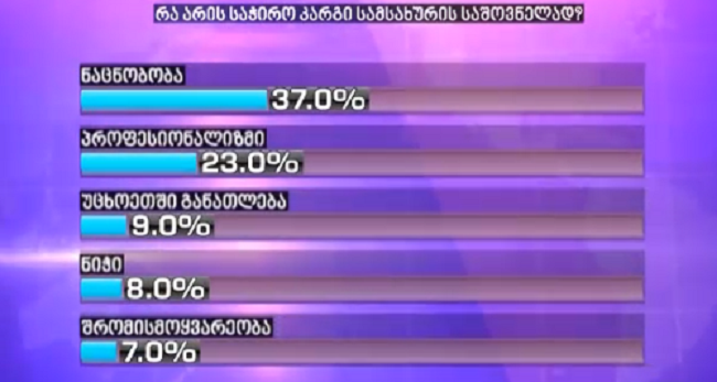 კითხვაზე, ამ პირობებიდან რომელი მიგაჩნიათ ყველაზე მნიშვნელოვნად საქართველოში კარგი სამსახურის საშოვნელად, გამოკითხულთა 37% აღნიშნავს, რომ ნაცნობობას ასახელებს, 23% პროფესიონალიზმსა და სამუშაო გამოცდილებას, უცხოეთში მიღებულ განათლებას 9% ასახელებს.